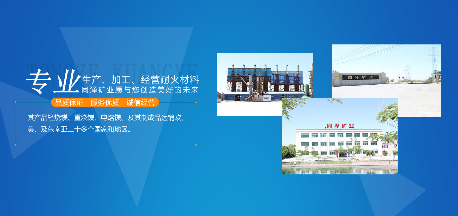 大石橋市同澤礦業(yè)有限公司,是以生產(chǎn)、加工、經(jīng)營(yíng)各種耐火材料為主的綜合性經(jīng)濟(jì)實(shí)體。其產(chǎn)品輕燒鎂、重?zé)V、電熔鎂、及其制成品遠(yuǎn)銷(xiāo)歐、美、及東南亞二十多個(gè)國(guó)家和地區(qū)。
